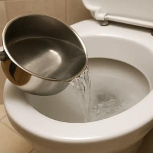 Pour finaliser le processus, faites chauffer 1 litre d’eau, puis versez-la directement dans la cuvette. L’eau bouillante permet de rincer les résidus dissous et de relancer l’écoulement. Tirez ensuite la chasse d’eau : si l’écoulement est fluide, c’est gagné !